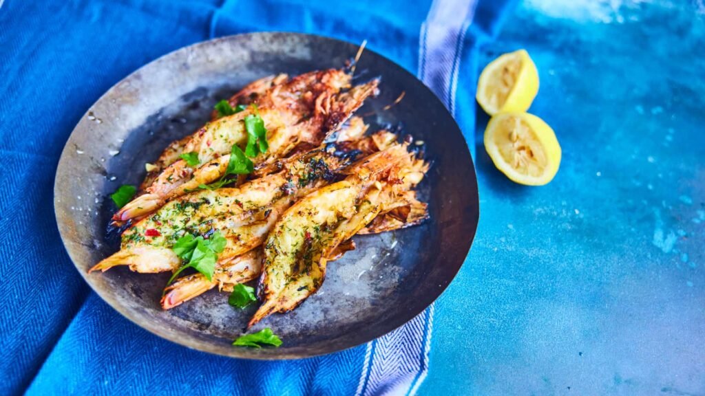 Butterflied prawns with garlic, chilli and herb butter