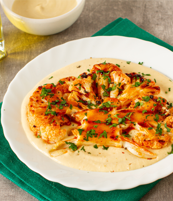This tender, caramelised cauliflower steak served with creamy herb-flecked tahini sauce makes a satisfying plant-based entrée that’s both elegant and nourishing.